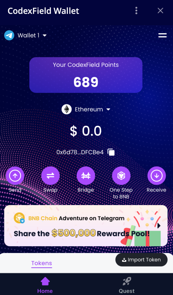 CodexFieldWallet is a tool that supports easy access to your EVM assets on TG applications and implements features such as swap, bridge, one step to BNB.